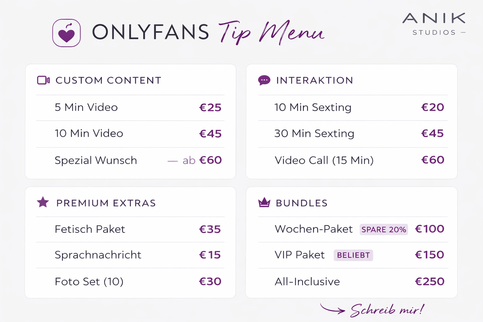 Das OnlyFans Menü ist im Grunde eine strukturierte Angebotsliste für zusätzliche Inhalte oder Services, die Fans gegen Trinkgeld (Tip) kaufen können. Es wird meist: